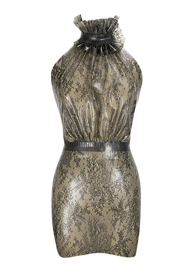 Printed Drama Frill Mini Dress in Semi-Trans Cloud Grey Lace