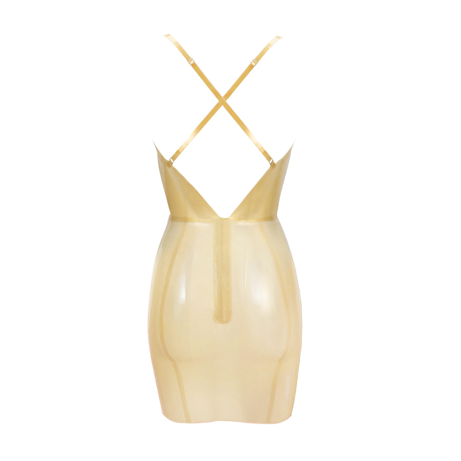 Featuring subtle ruching at the bust and slim, adjustable straps, it also has an open back and a sleek mini skirt.