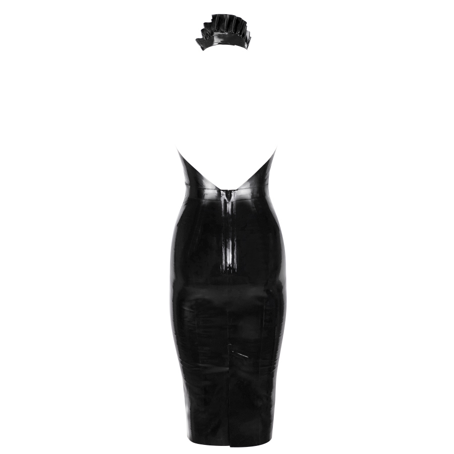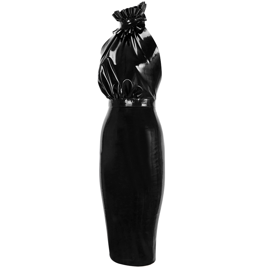 The Drama frill dress is a timeless piece with a beautifully ruffled collar and ruched halter neck. It also features an open back and a sleek pencil skirt.