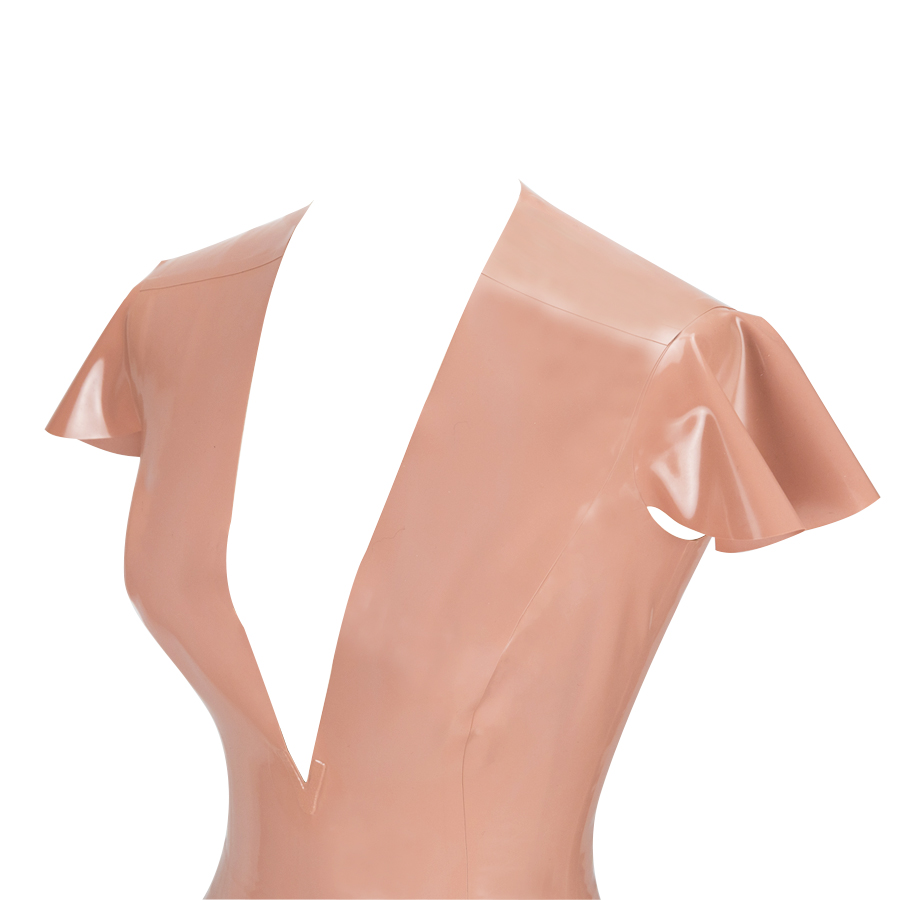 The neck is cut into a flattering Mid V neck that sits below the bust line and gives modest support whilst being a little more revealing. Pretty capped sleeves complete the look.